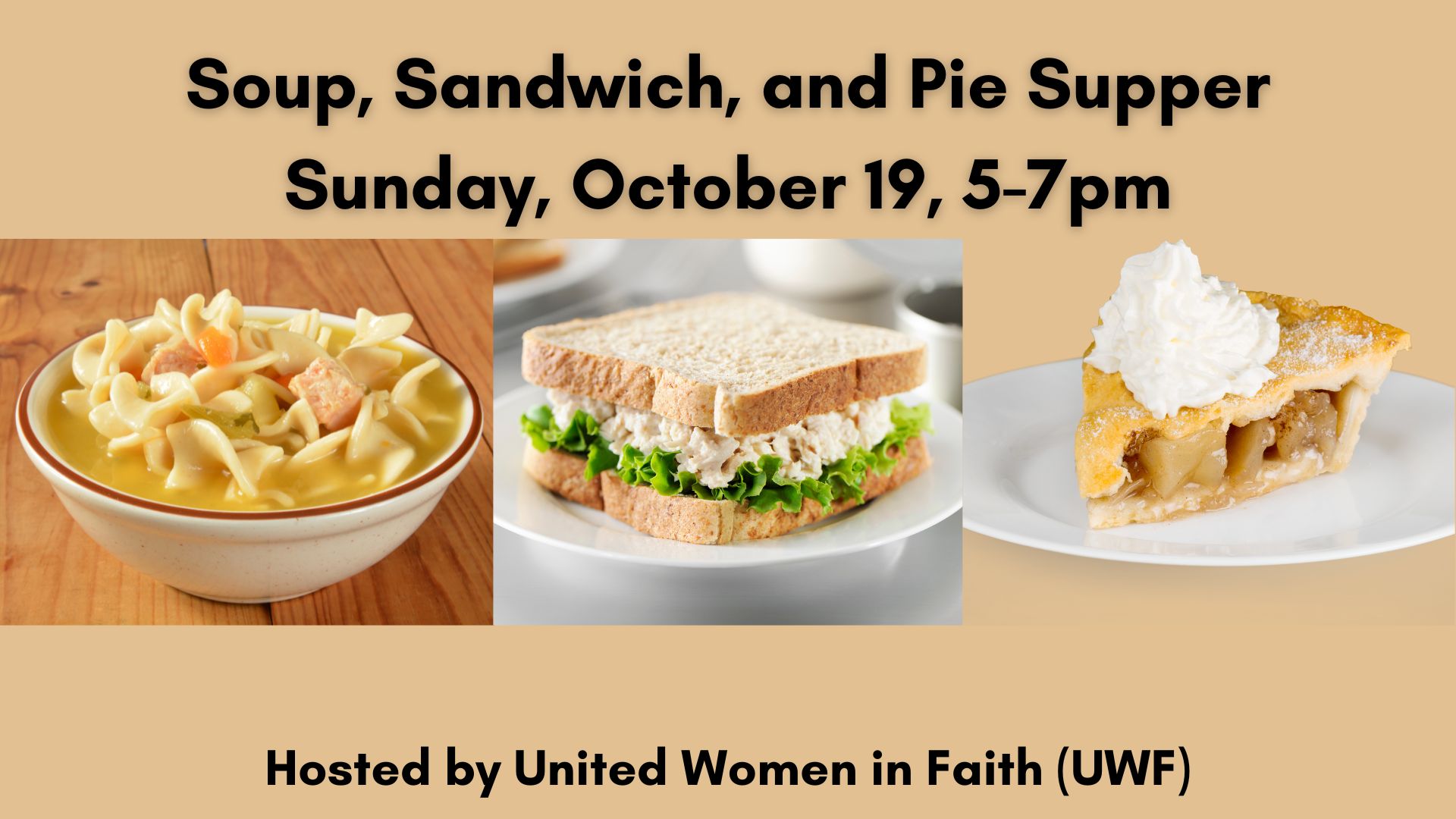 And...one more thing to cap of a great weekend...no need to cook Sunday evening. Join us for the Soup, Sandwich, and Pie Supper, 5-7pm! It's an annual event put together by the United Women in Faith group. Tickets available at the door. They are $12 for adults/teens, $6 for ages 6-12, ages 5 and under are free.